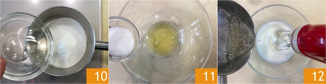 Mientras tanto, preparad el merengue italiano comenzando con el jarabe: en un cazo verted 150 g de azúcar y el agua 10. Encended el fuego y dejad que el azúcar se disuelva, teniendo cuidado de monitorear la temperatura con un termómetro; deberá llegar a 121°C. Mientras tanto, en un bol añadid las claras y los restantes 40 g de azúcar 11, luego empezad a montar. Cuando el jarabe haya alcanzado la temperatura, vertedlo en hilo sobre las claras 12, continuando a batir a baja velocidad hasta que la mezcla se haya enfriado.