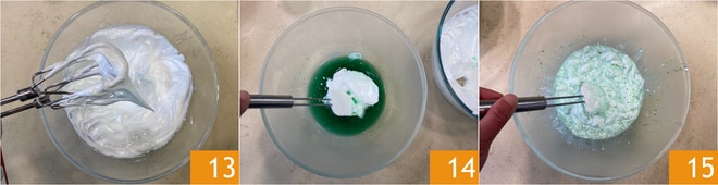El merengue italiano estará listo cuando tenga un aspecto brillante y al levantar las varillas notéis que se forma un pico 13, el llamado 'pico de gallo'. Incorporad el merengue a la mezcla de menta 14 y mezclad con una varilla para incorporarla 15. Dejad reposar en el frigorífico durante unos 10-15 minutos, para que se endurezca pero no se gelatinice.