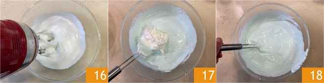 Mientras tanto, semi-montad la nata 16. Retomad la mezcla del frigorífico e incorporad la nata semi-montada 17, mezclando delicadamente de abajo hacia arriba 18. Transferid todo a una manga pastelera.