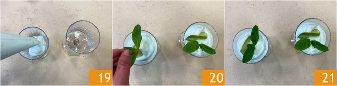 Distribuid la mousse en 6 vasitos con capacidad de 100 g 19, luego decorad con rodajas de lima y hojas de menta 20. Conservad en el frigorífico hasta el momento de servir. ¡Vuestra mousse de mojito está lista para ser disfrutada 21!