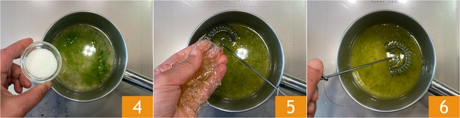 Añadid el azúcar 4 y calentad durante unos minutos, removiendo. En este punto, incorporad la gelatina bien escurrida 5 y dejad que se disuelva completamente 6.