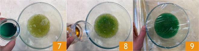 Transferid todo a un bol, luego añadid el jarabe de menta 7 y el ron 8 y mezclad. Cubrid con papel film 9 y dejad enfriar a temperatura ambiente.