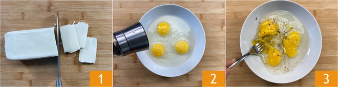 Para preparar mozzarella y jamón en carroza, corta la mozzarella en rodajas finas 1. En un plato rompe 3 huevos, condimenta con sal y pimienta 2 y bátelos con un tenedor 3.