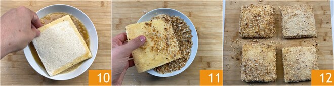 Entonces cubre todo el pan con el huevo 10. Finalmente, empana con la mezcla de pan rallado 11. Obtendrás 4 piezas 12 con estas cantidades.
