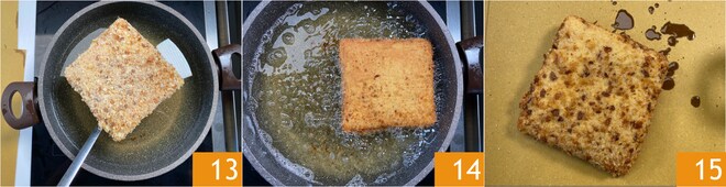 Calienta el aceite hasta una temperatura de 160° y sumerge delicadamente una pieza a la vez 13. Después de unos 3 minutos, da la vuelta a las mozzarellas en carroza y dora bien durante otro minuto 14. Escúrrelas sobre papel para freír 15. ¡Sirve enseguida las mozzarellas y jamón en carroza!