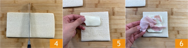 Obtén 8 rebanadas cuadradas de pan de aproximadamente 12 cm 4, si encuentras pan ya en rebanadas, mejor. Rellena cada rebanada con mozzarella 5 y jamón cocido 6.