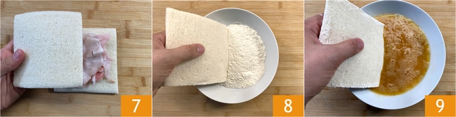Cierra con otra rebanada de pan 7 y aplana los bordes delicadamente. Pasa ahora primero por la harina 8, luego sella bien todo el borde en el huevo 9.