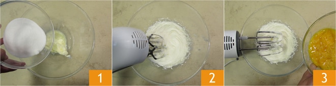 Para preparar los muffins con yogur, mango y maracuyá, debéis dejar que la mantequilla se aclimate fuera de la nevera durante unos 30 minutos, para ablandarla. Luego podréis verterla en un bol grande 1 y trabajarla con las varillas junto con el azúcar 2, hasta obtener una mezcla montada. Agregad los huevos poco a poco 3.