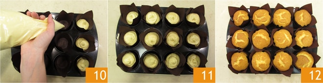 Tamizad y añadid poco a poco la harina y la levadura 7, incorporando siempre con las varillas y una vez terminado obtendréis una mezcla bastante densa 8. Con la ayuda de una espátula, vertedla en una manga pastelera 9.