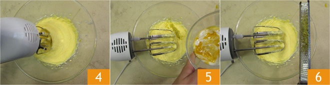 Continuad trabajando con las varillas 4. Cuando estén bien mezclados, verted el yogur de leche de heno con mango y maracuyá 5, continuad trabajando para amalgamar todo, luego aromatizad con la ralladura de limón 6.