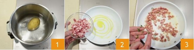 Para preparar los muffins de patatas, empezad hirviendo la patata en agua ligeramente salada 1; cocedla hasta que podáis perforarla con los dientes de un tenedor (tardará unos 30 minutos, pero podéis reducir el tiempo usando una olla a presión). Mientras tanto, en una sartén calentad un chorrito de aceite y añadid los cubitos de bacon ahumado 2; dejad que se dore unos minutos y sazonadlo con las hojitas de tomillo 3.