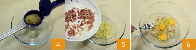 Una vez cocida la patata, aplastadla todavía caliente con un prensapatatas 4 (o dejadla enfriar un poco, peladla y luego aplastadla con los dientes de un tenedor) y recoged la pulpa en un bol pequeño; añadid los cubitos de bacon dorados 5 y los huevos 6. Mezclad los ingredientes con un tenedor,