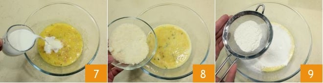 luego añadid la leche 7 y el Grana Padano rallado 8, después tamizad la harina en el bol 9