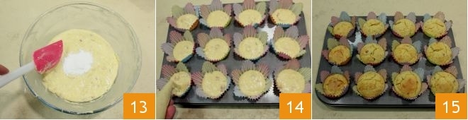 Mezclad todo de nuevo con la espátula 13 y transferid la mezcla obtenida a una manga pastelera. Forrad un molde de muffins con moldes de papel de colores y rellenadlos con la masa hasta el borde 14 (para que en la cocción crezcan con la típica forma de hongo). Cocedlos en horno estático precalentado a 180° durante unos 20 minutos (160° durante unos 15 minutos si es horno ventilado). Una vez cocidos, sacad los muffins de patatas del horno 15 y dejad que se enfríen un poco antes de servirlos.
