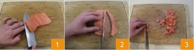 Para preparar los muffins con feta y salmón, comienza con la preparación del salmón. Coloca el salmón sobre una tabla de cortar y quítale la piel con la ayuda de un cuchillo 1. Ahora toma unas pinzas y retira las espinas del salmón. Luego corta el salmón en tiras 2 y después en cubos 3.