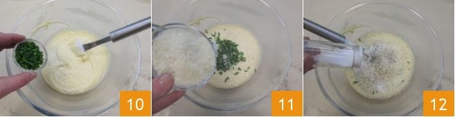 Incorpora ahora al compuesto el cebollino finamente picado 10 y el Grana Padano rallado 11 que darán un sabor más pronunciado a tus muffins. Continúa mezclando los ingredientes para hacer el compuesto homogéneo. Ajusta de sal y pimienta 12.