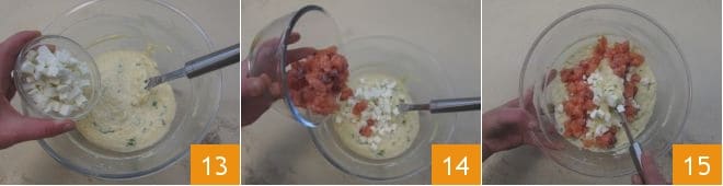 Luego añade la feta 13 y también el salmón cortado en cubos 14. Continúa amasando mezclando delicadamente todos los ingredientes 15.