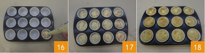 Ahora toma unos moldes para muffins. Transfiere la mezcla obtenida a una manga pastelera 16 y llena los moldes casi hasta el borde 17. Hornea tus muffins con feta y salmón en el horno precalentado a 180°C durante 25-30 minutos 18 y... ¡buen provecho!