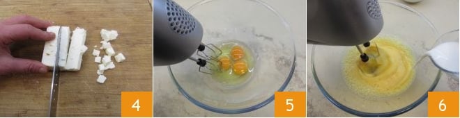 A continuación, pasa a preparar la feta. Toma la feta y córtala en tiras, luego también en cubos 4. Ahora toma un bol y rompe tres huevos ayudándote con las varillas 5. Bátelos y añade la leche 6