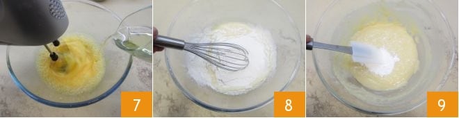 y el aceite de semillas 7 hasta obtener una mezcla homogénea. Ahora tamiza la harina y únela a la mezcla de huevos, aceite y leche 8. Luego añade la levadura 9.