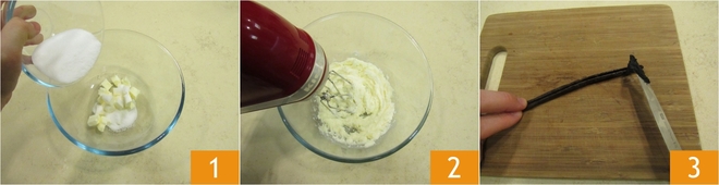 Para preparar los muffins con pepitas de chocolate, dejad la mantequilla al menos 1 hora fuera del frigorífico para que se ablande. Añadid al azúcar 1 la mantequilla blanda, trabajad con las varillas eléctricas hasta obtener una mezcla espumosa y cremosa 2. Luego, cortad una vaina de vainilla y raspad las semillas usando el dorso de un cuchillo 3