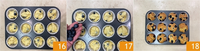 Para cada molde irán unos 70 g de mezcla, de modo que se llene 2/3 16. Decora cada muffin con los arándanos restantes, necesitarás unos 4 para cada uno 17 y hornea en horno estático precalentado a 180°C durante 30-32 minutos. Haz siempre la prueba del palillo antes de sacar los muffins del horno, luego déjalos templar antes de servirlos 18.