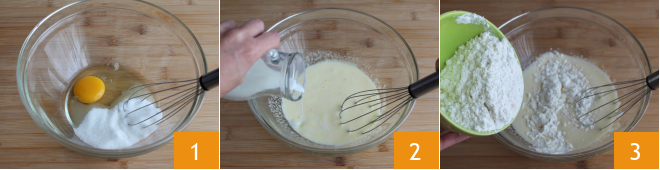 Para hacer los muffins de manzana y chocolate sin gluten, funde la mantequilla en un cazo a fuego lento y deja que se enfríe. En un bol, rompe el huevo a temperatura ambiente, añade el azúcar 1 y bate con una varilla manual. Añade a continuación la leche a temperatura ambiente poco a poco 2, mezclando. Incorpora también la harina de arroz 3.