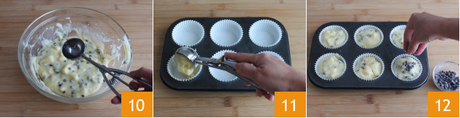 Con un dosificador de helado 10 llena 6 moldes para muffins en los que habrás colocado cápsulas de papel 11. Decora la superficie con las gotas de chocolate restantes 12 y con avellanas picadas.