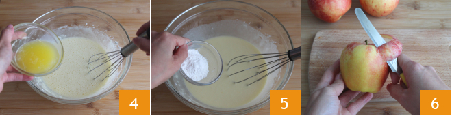 La mantequilla fundida templada 4 y, por último, la levadura 5. Mezcla para integrar y luego pela las manzanas.