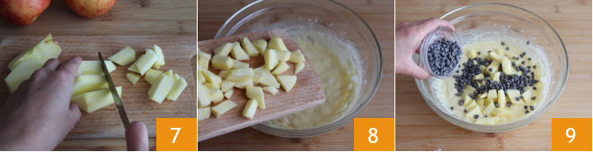 Córtalas en dados 7 y añádelas a la masa 8; para terminar, incorpora parte de las gotas de chocolate 9, dejando unas cucharadas aparte para añadir por la superficie.