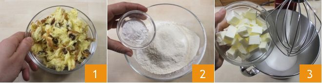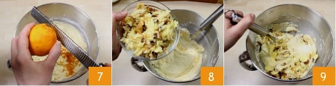 Cuando los ingredientes estén bien integrados, añadid la cáscara rallada de una naranja no tratada 7 y el panettone desmenuzado antes 8, incorporándolo a la mezcla con una espátula 9.