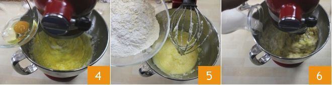 Añadid los huevos uno a uno 4, los ingredientes secos 5 y por último la leche poco a poco 6, continuando montando.