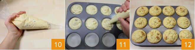 Transferid la mezcla a una manga pastelera 10, preparad un molde de muffins con las cápsulas y llenadlas hasta el borde 11. Cocedlos en el horno precalentado a 180° durante 25 minutos 12: ¡aquí están listos los muffins de panettone!