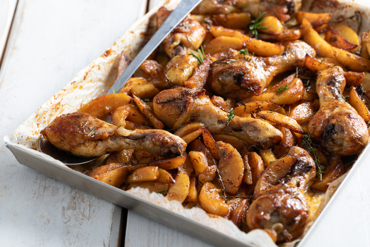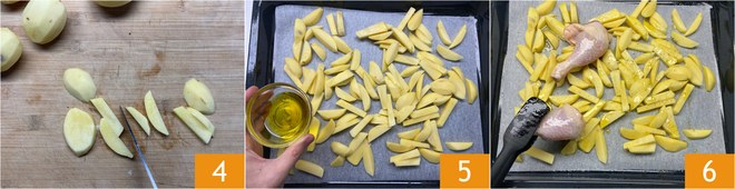 Cortadlas en 8 gajos 4, colocadlas en una bandeja forrada con papel de horno y condimentadlas con aceite 5, sal y pimienta. Colocad los muslos de pollo 6.