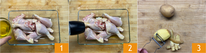 Para preparar los muslos de pollo al horno, colocad los muslos en una fuente y condimentadlos con aceite 1, sal 2 y pimienta. Pelad las patatas 3.