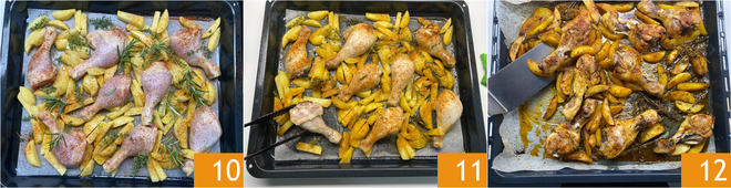 Coced en horno estático precalentado a 230° durante 40 minutos 10. Pasados 20 minutos, dad la vuelta a los muslos de pollo 11 y removéis las patatas para una cocción homogénea. Tras 40 minutos, mezclad nuevamente las patatas con una espátula de silicona y coced durante otros 5 minutos siempre a 230° pero cambiando a modo ventilado. Servid enseguida vuestros muslos de pollo al horno 12!