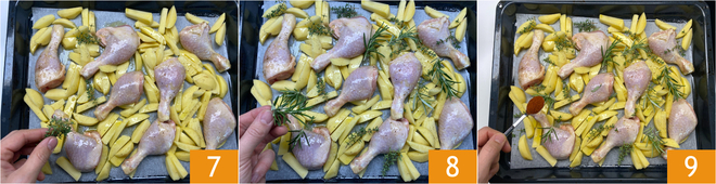 Aromatizad con tomillo 7 y romero 8. Finalmente, espolvoread con pimentón picante 9.