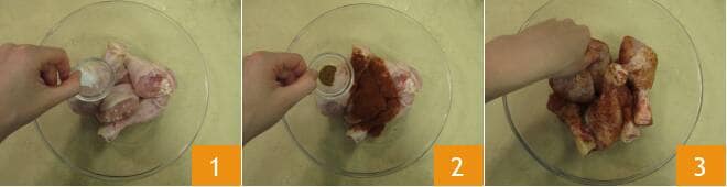 Para preparar el pollo al pimentón, comenzad sazonando los muslos con sal 1, pimentón dulce y picante 2. Mezclad bien con las manos para distribuir los aromas 3.