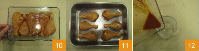 Cubrid con film transparente y dejad marinar en el frigorífico al menos 30 minutos 10. Pasado el tiempo necesario, retirad los muslos y colocadlos en una bandeja 11, para comodidad, la marinada podéis verterla en un cuenco 12.