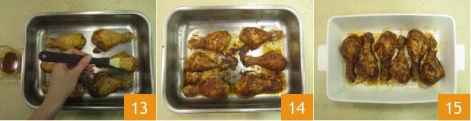 Pincelad la superficie de los muslos con la marinada 13 y hornead en horno estático, ya caliente a 200°, durante unos 45 minutos. Cada 10 minutos deberéis pincelar la superficie de los muslos y darles la vuelta a mitad de cocción 14. ¡Una vez listo vuestro pollo al pimentón, podréis consumirlo aún muy caliente 15!