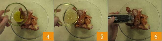 Verted el aceite 4, el vino blanco 5 y aromatizad al gusto con pimienta 6.