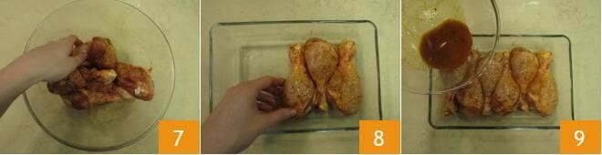 Continuad masajeando los muslos, dejando que se impregnen bien de manera uniforme 7. Tan pronto como los ingredientes se hayan amalgamado, trasladad los muslos sazonados a una fuente de horno donde estén uno al lado del otro 8 y verted la marinada por encima 9.