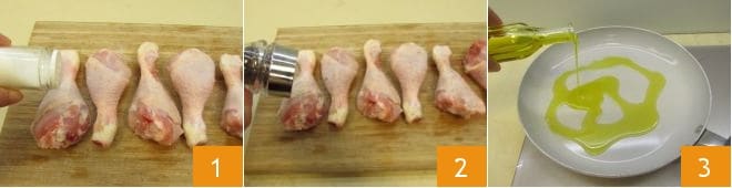 Para preparar los muslos de pollo con miel, toma tus muslos, asegúrate de que no queden restos de plumas, de lo contrario quémalas al fuego y luego lava los muslos bajo el agua corriente. Seca la carne con un paño de cocina y colócala sobre la tabla de cortar, luego sazona con sal fina 1 y pimienta negra 2 por ambos lados. Ahora vierte el aceite de oliva en una sartén 3,