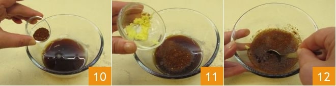 el chile seco en polvo 10 y el jengibre rallado 11. Mezcla la mezcla con una cucharilla 12