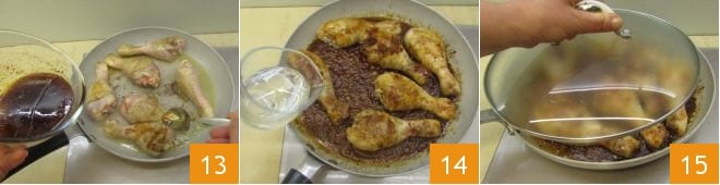 y una vez que los muslos estén dorados, viértela encima poco a poco con una cuchara 13. Añade también el agua a temperatura ambiente 14, cubre con la tapa 15