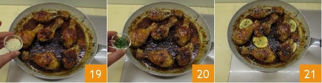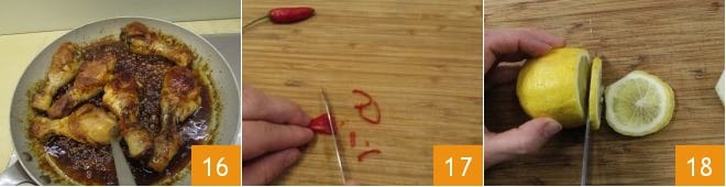 continúa la cocción a fuego bajo durante 25 minutos, girando los muslos de vez en cuando. Transcurrido el tiempo indicado, quita la tapa 16 y sigue cocinando los muslos para espesar la salsa, tomará unos 3-4 minutos. Mientras tanto, quita las semillas al chile fresco y córtalo en rodajas 17, corta también el limón en rodajas 18.