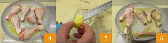déjalo calentar y luego coloca los muslos de pollo 4 que deberán dorarse a fuego moderado durante 2-3 minutos. Mientras tanto pela el jengibre fresco y rállalo 5, luego gira los muslos con unas pinzas de cocina 6 y continúa la cocción por otros 2-3 minutos, para dorarlos por ambos lados.