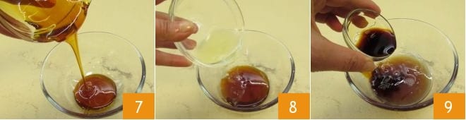 Mientras tanto, prepara la salsa: en un bol vierte la miel 7, el zumo de limón 8, el vinagre balsámico 9