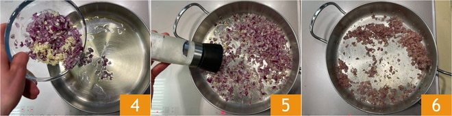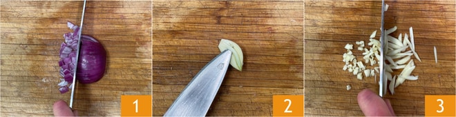 Para preparar los nachos con carne, comienza con la carne: limpia y pica finamente la cebolla roja 1, luego quita el brote interno del ajo 2 y pica finamente también este 3.