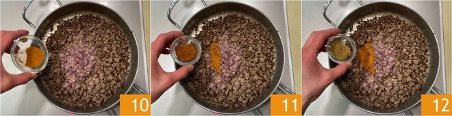 Sazona con las especias en polvo: el comino 10, el chile 11 y el cilantro 12.
